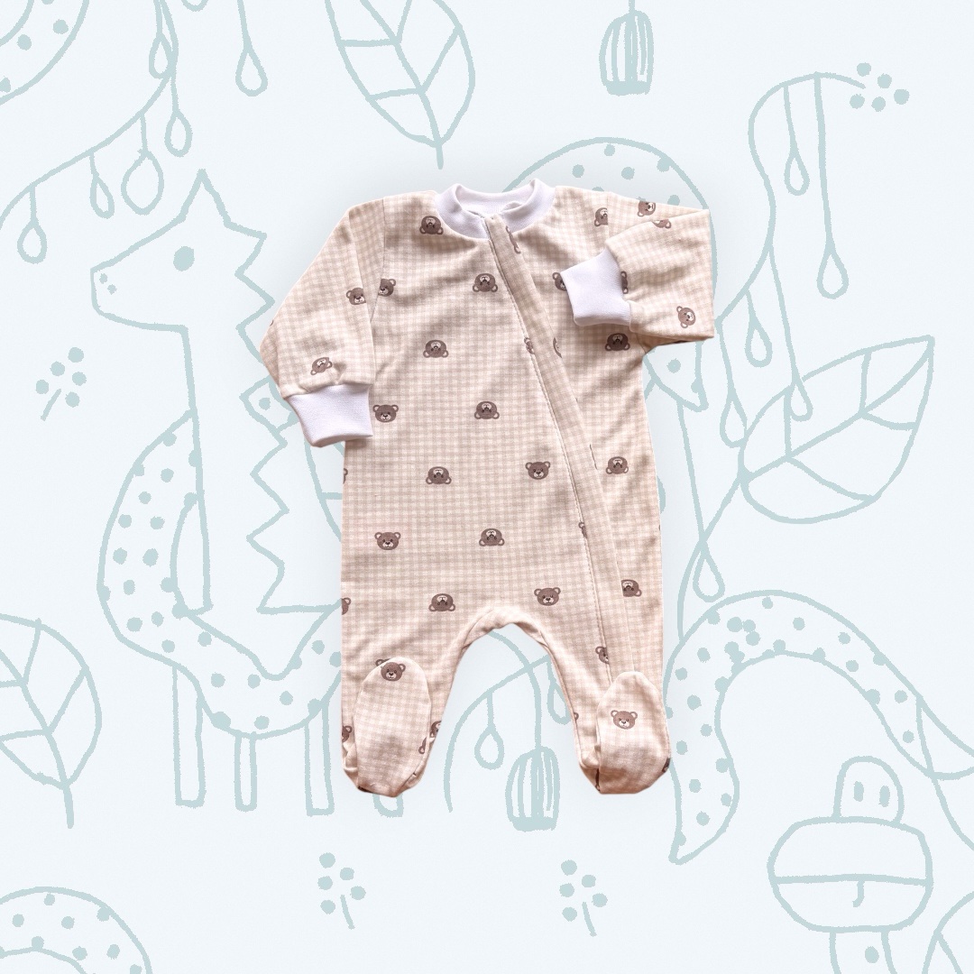 Elöl cipzárral záródó, mintás rugdalózó.