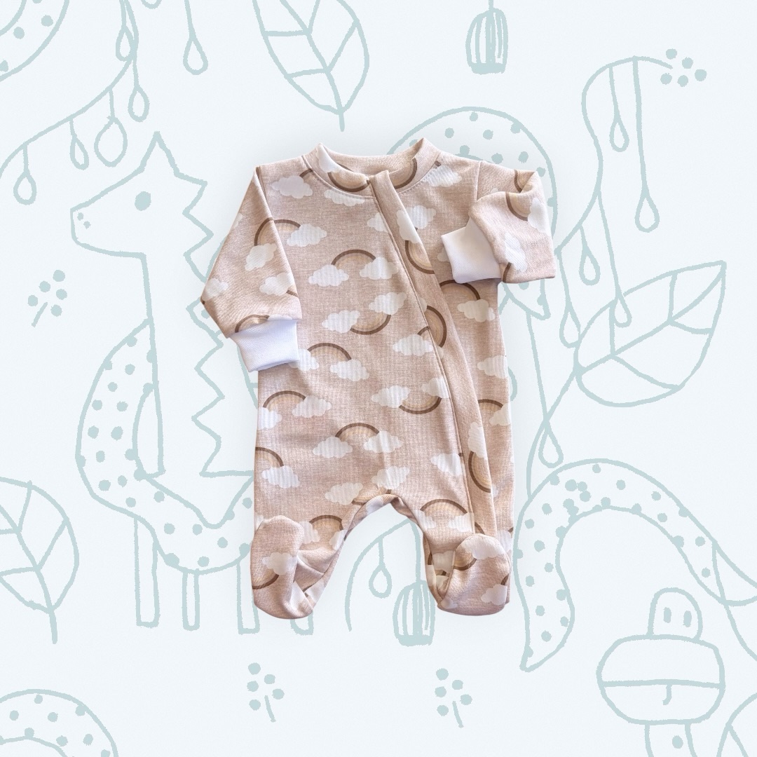 Elöl cipzárral záródó, mintás rugdalózó.